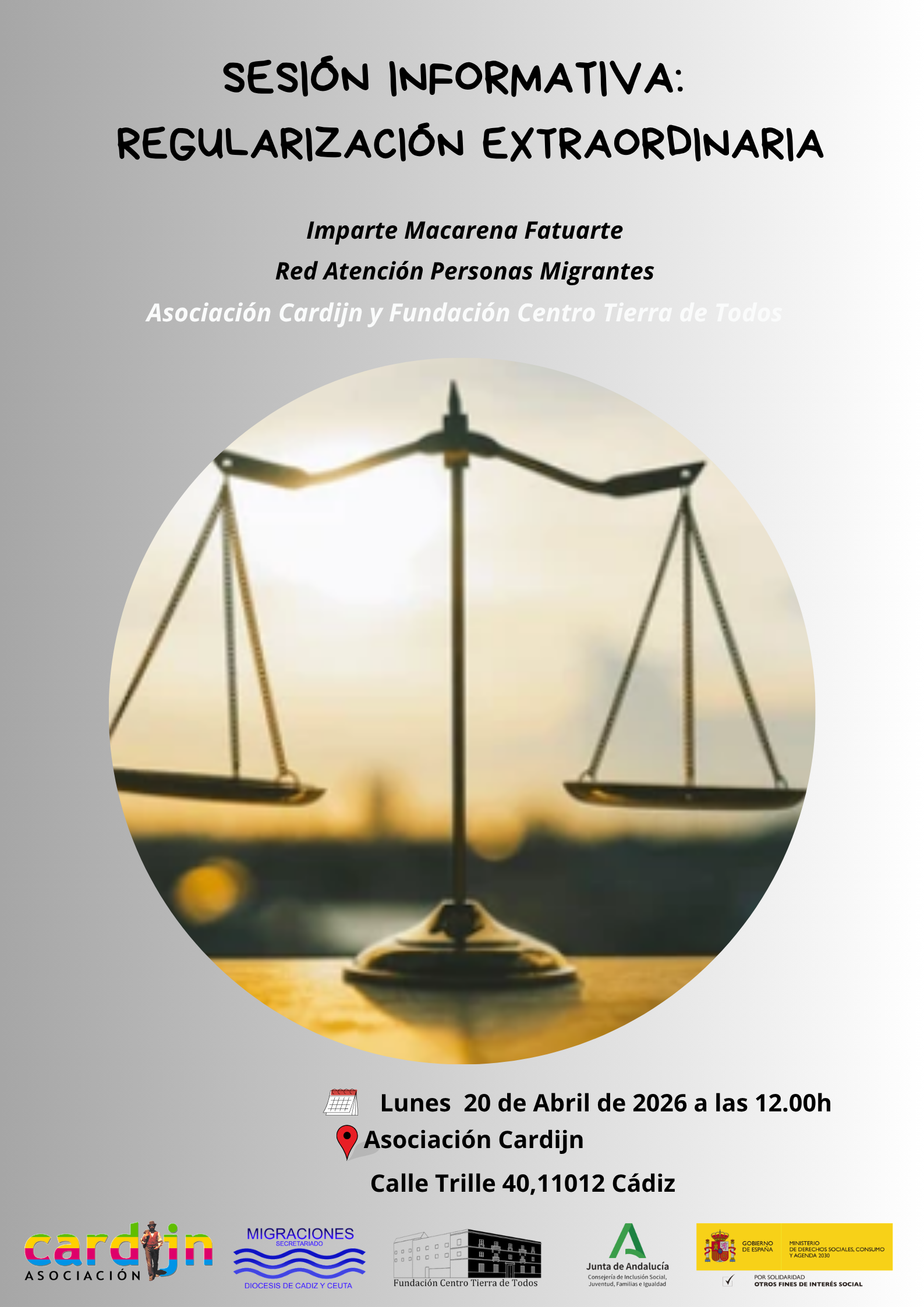 👉SESIÓN 1: LUNES 20/04/2026 A LAS 12:00h en la ASOCIACIÓN CARDIJN-Edificio Tartessos- C/Trille nº 40-Cádiz.